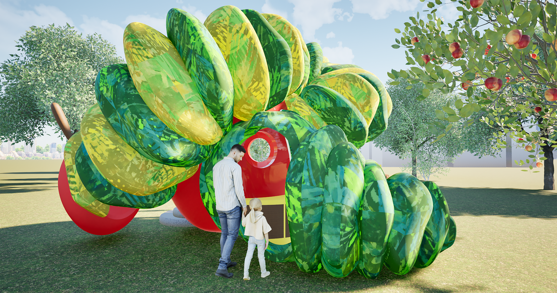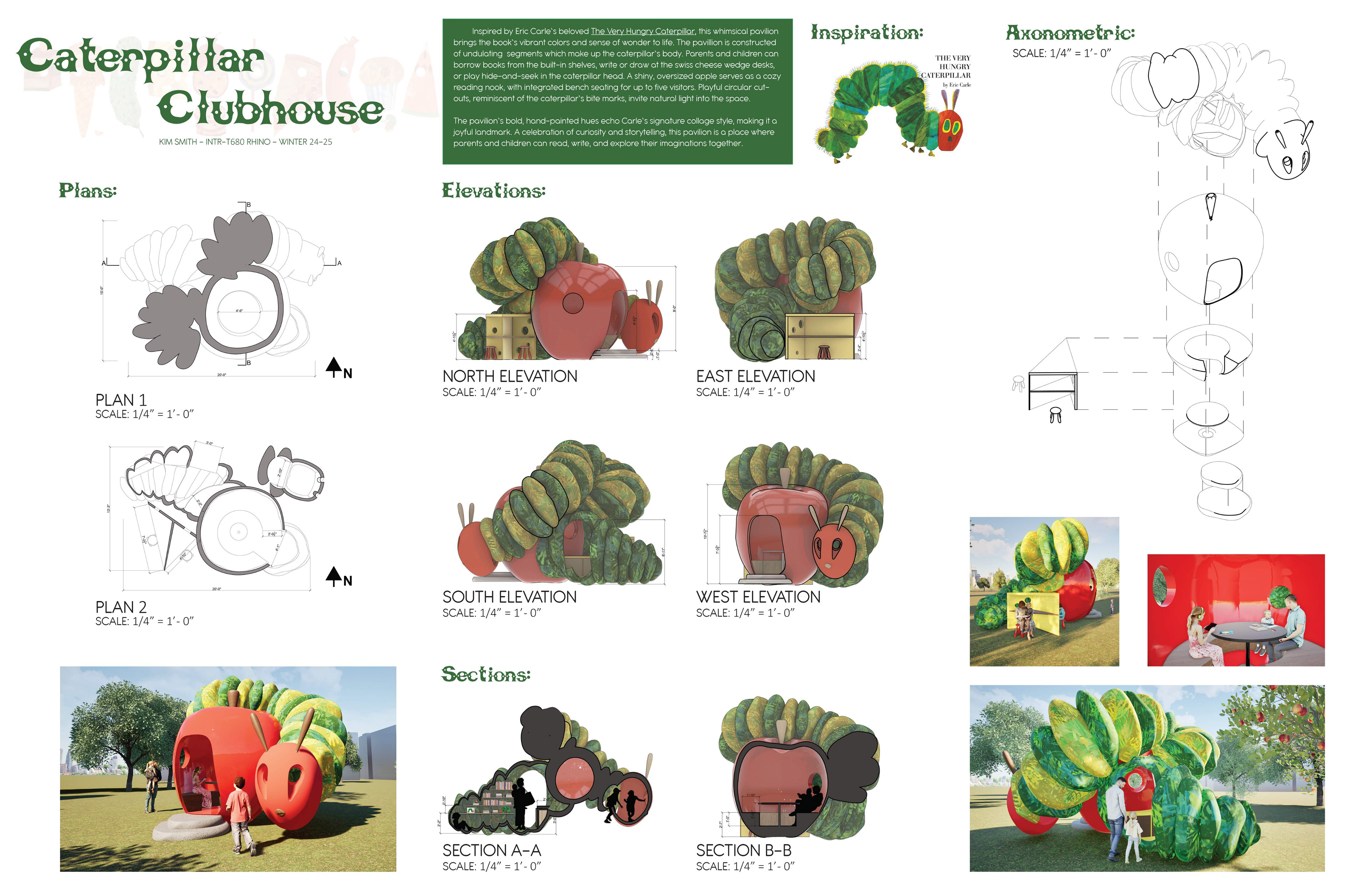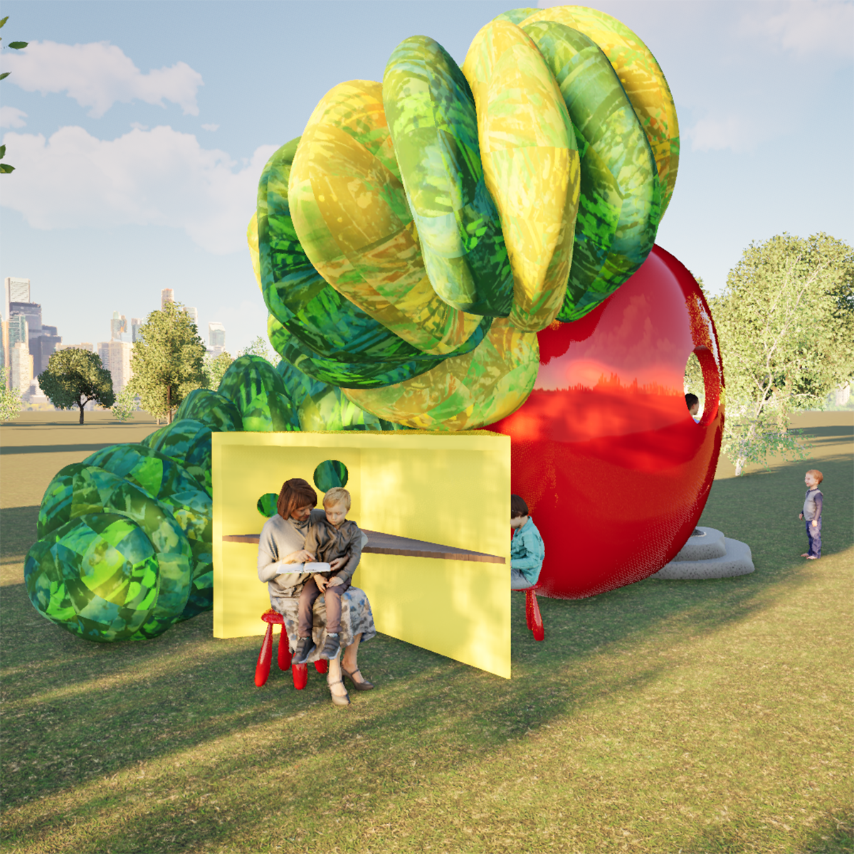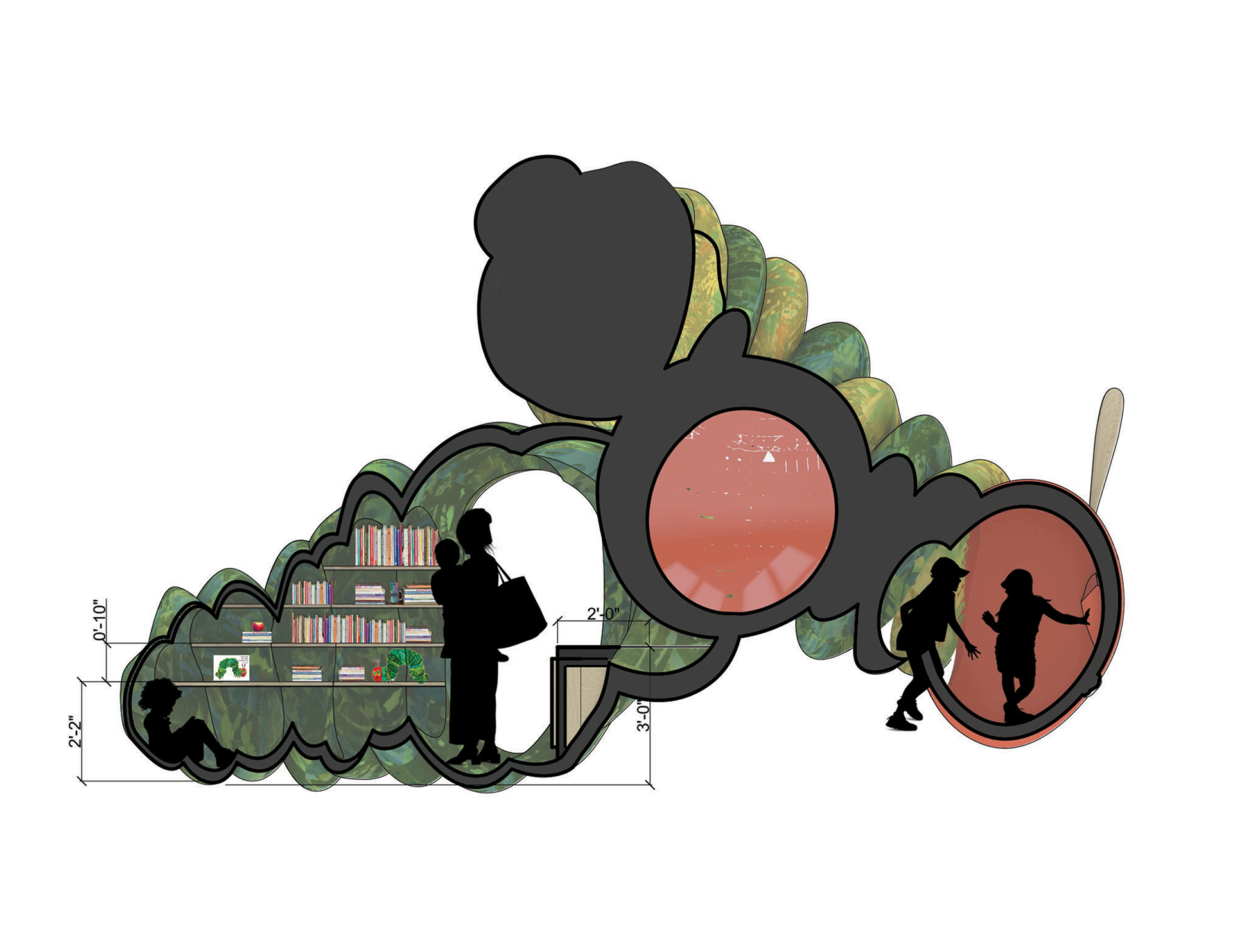 Inspired by Eric Carle's beloved The Very Hungry Caterpillar, this whimsical pavilion brings the book's vibrant colors and sense of wonder to life. Parents and children can borrow books from built-in shelves, write or draw at the Swiss cheese desks, or play hide-and-seek in the caterpillar head. An oversized apple serves as a cozy reading nook, with integrated bench seating for up to five visitors.