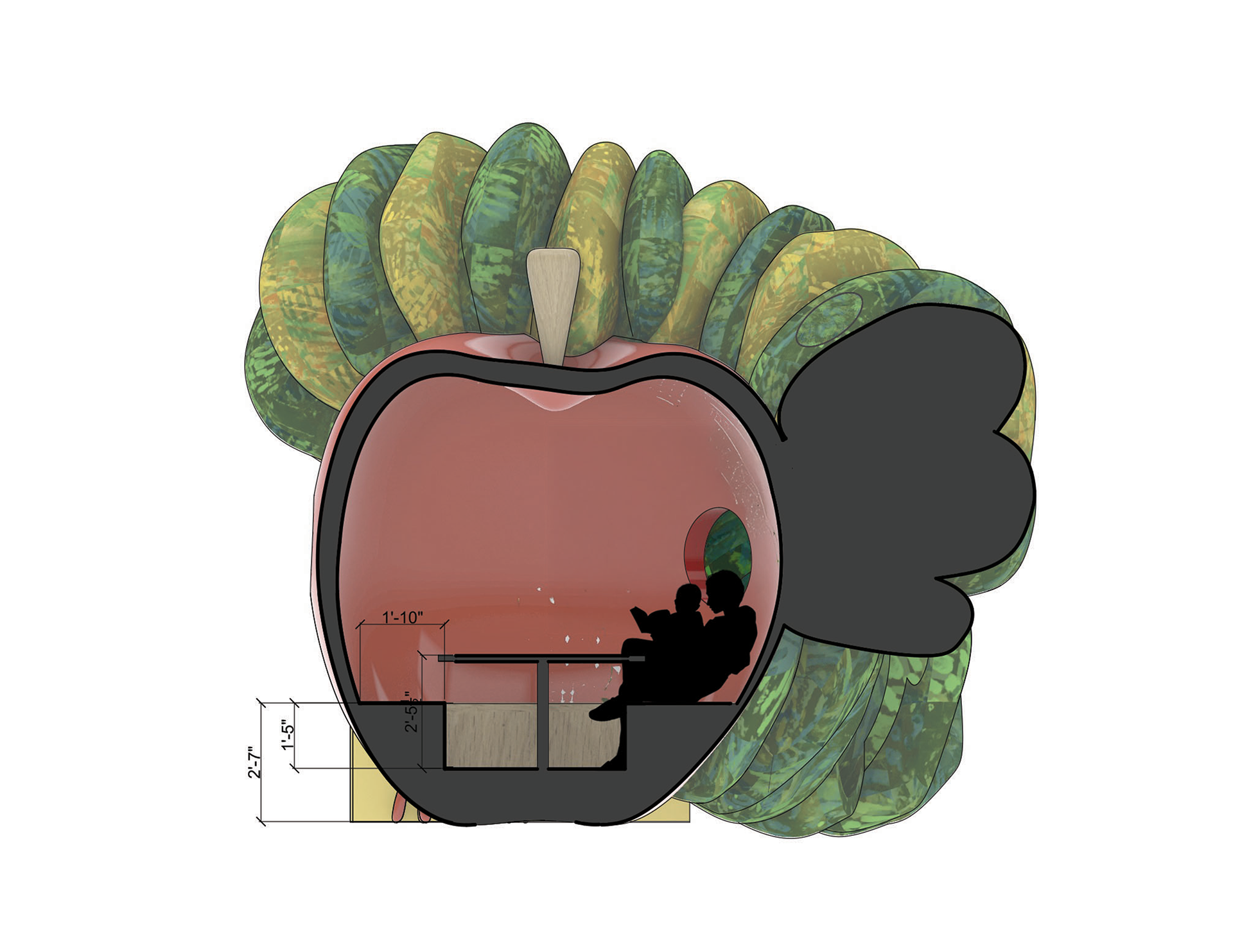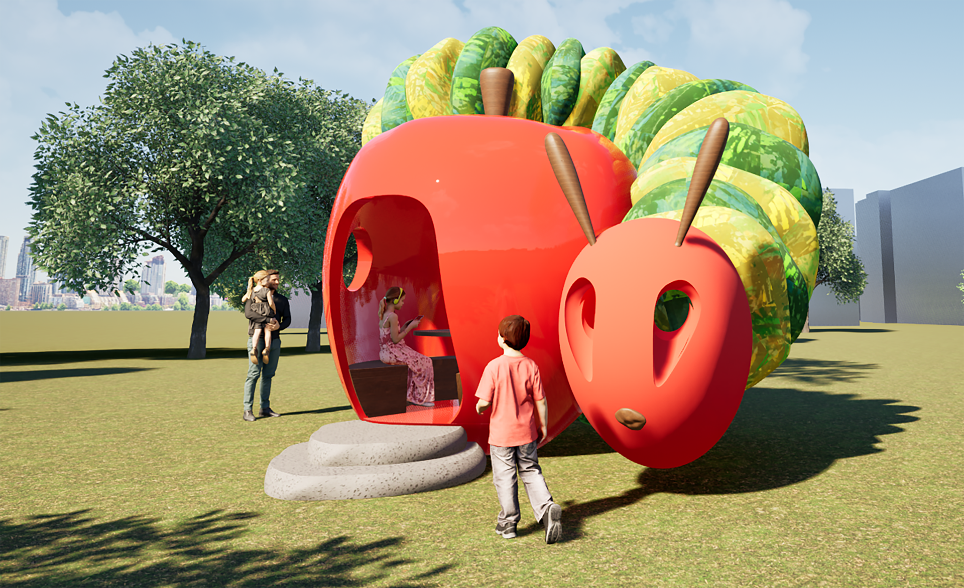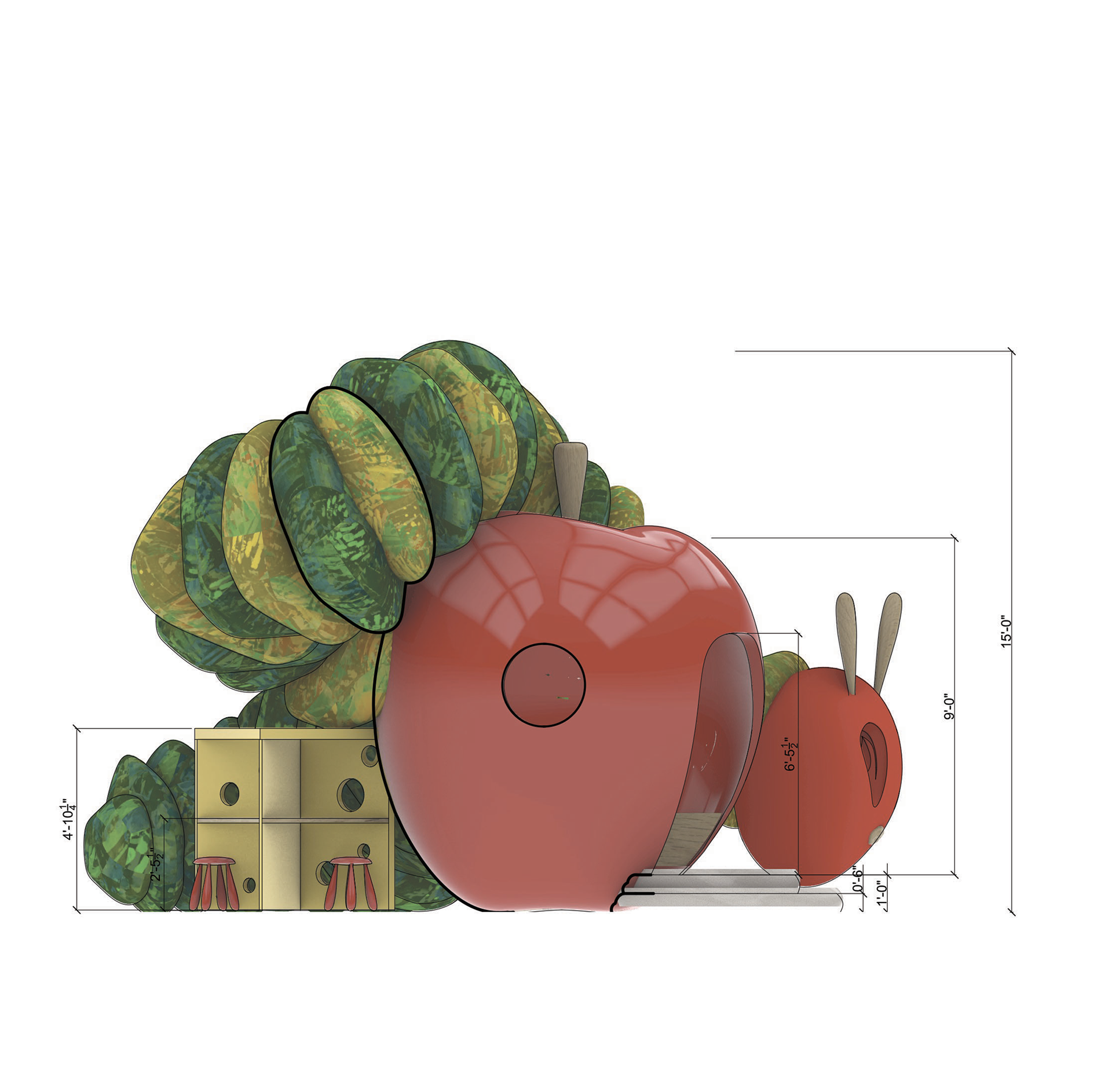 Inspired by Eric Carle's beloved The Very Hungry Caterpillar, this whimsical pavilion brings the book's vibrant colors and sense of wonder to life. Parents and children can borrow books from built-in shelves, write or draw at the Swiss cheese desks, or play hide-and-seek in the caterpillar head. An oversized apple serves as a cozy reading nook, with integrated bench seating for up to five visitors.