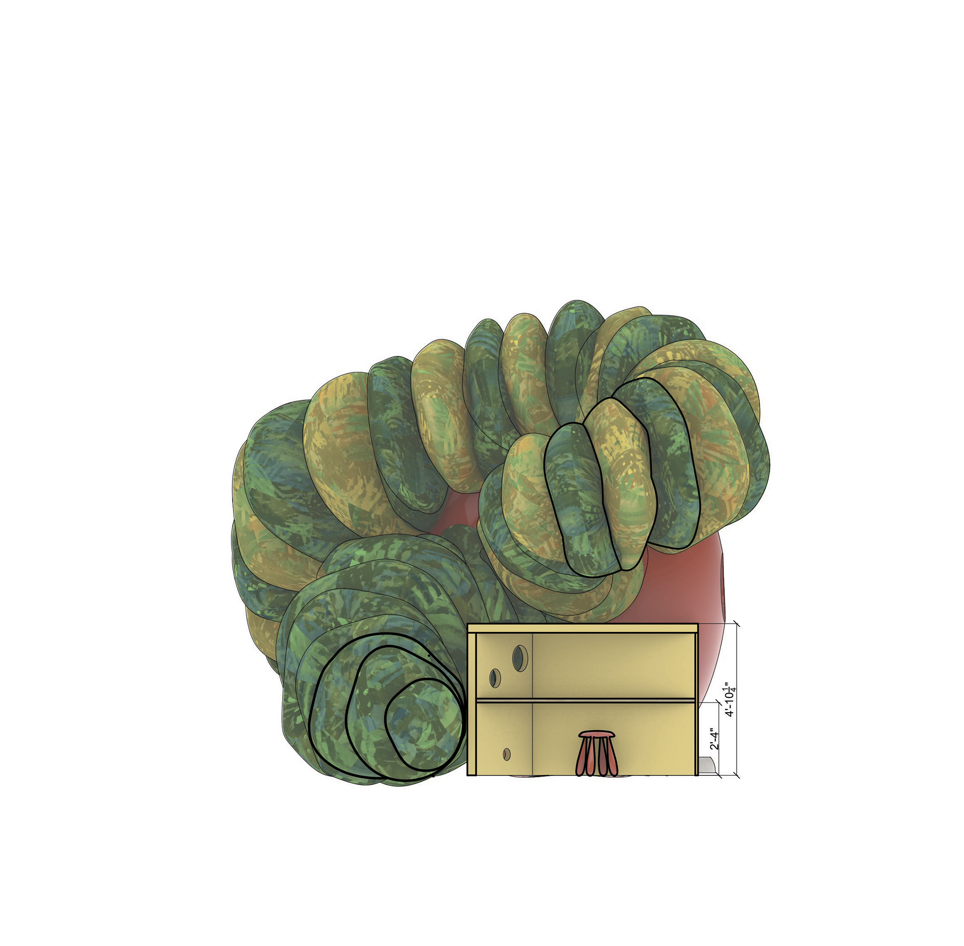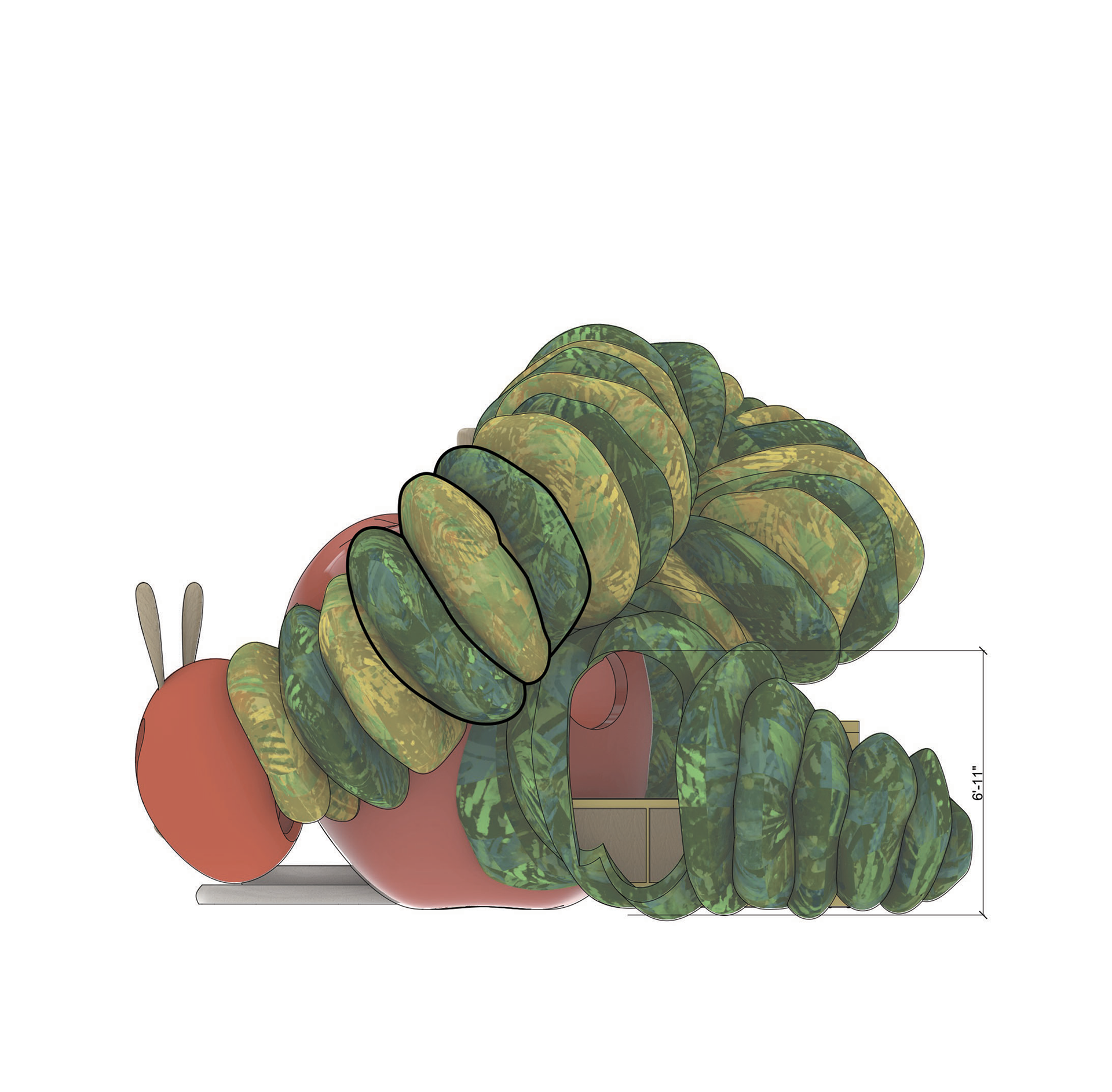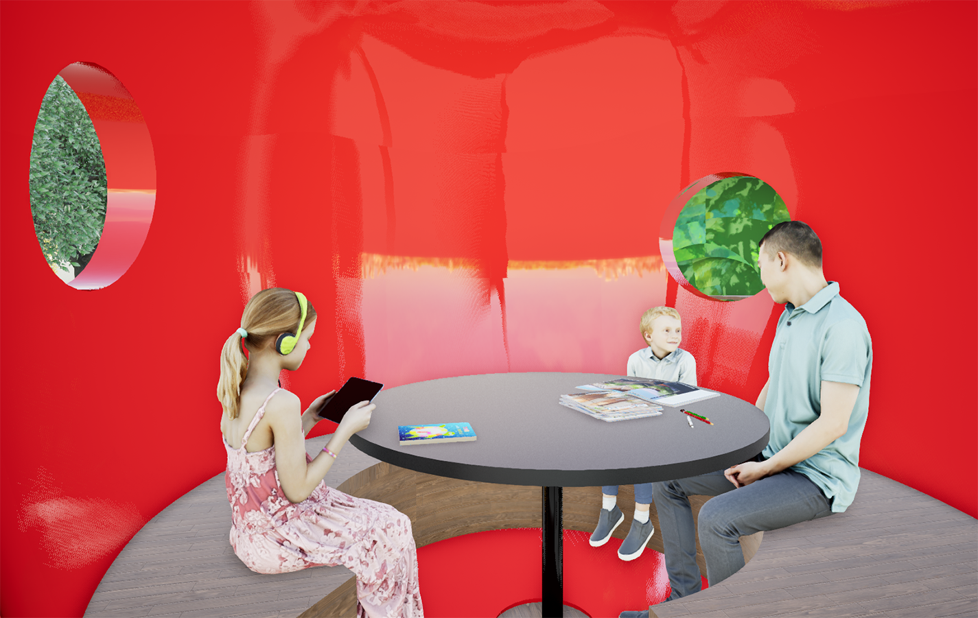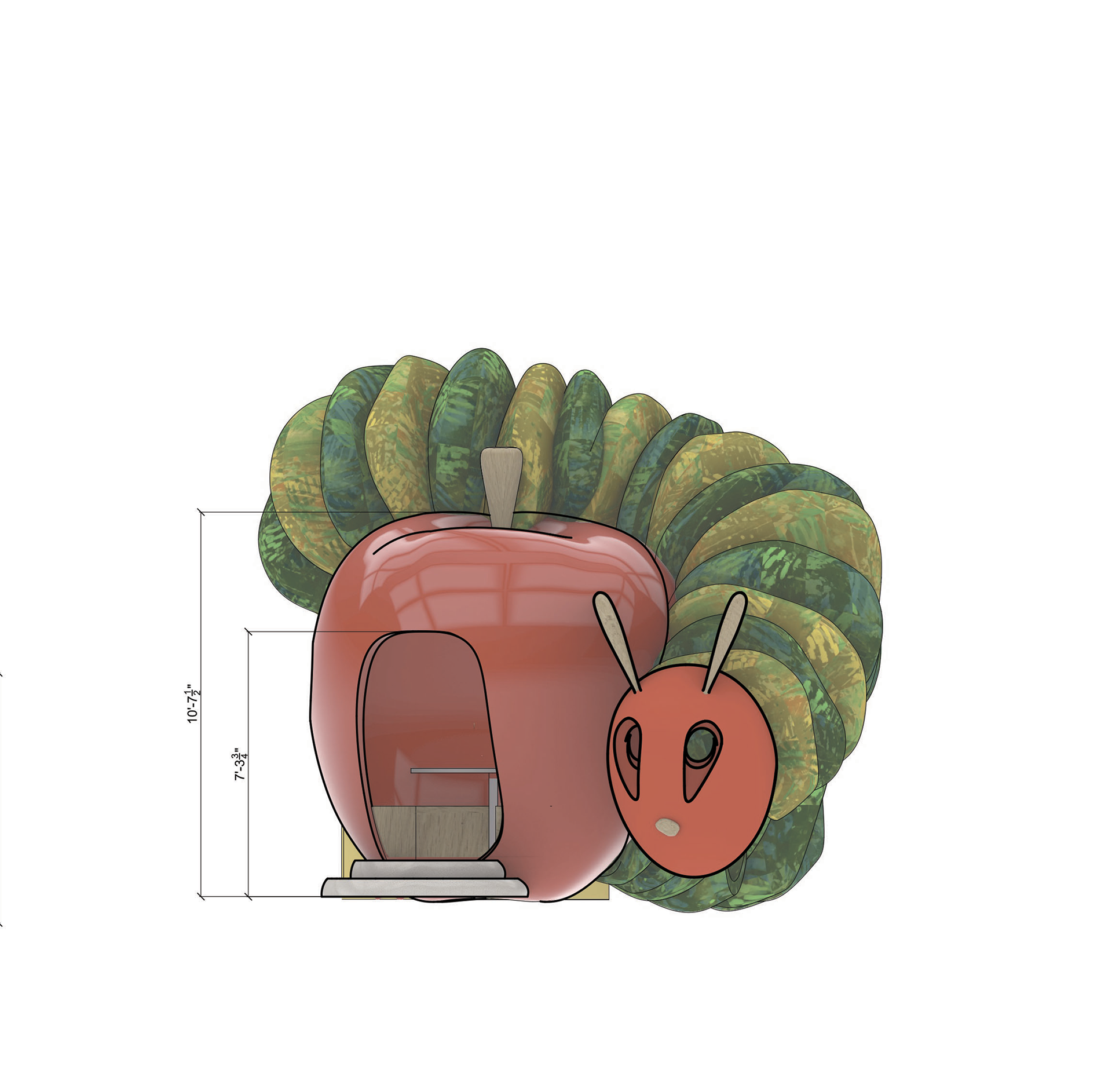 Inspired by Eric Carle's beloved The Very Hungry Caterpillar, this whimsical pavilion brings the book's vibrant colors and sense of wonder to life. Parents and children can borrow books from built-in shelves, write or draw at the Swiss cheese desks, or play hide-and-seek in the caterpillar head. An oversized apple serves as a cozy reading nook, with integrated bench seating for up to five visitors.