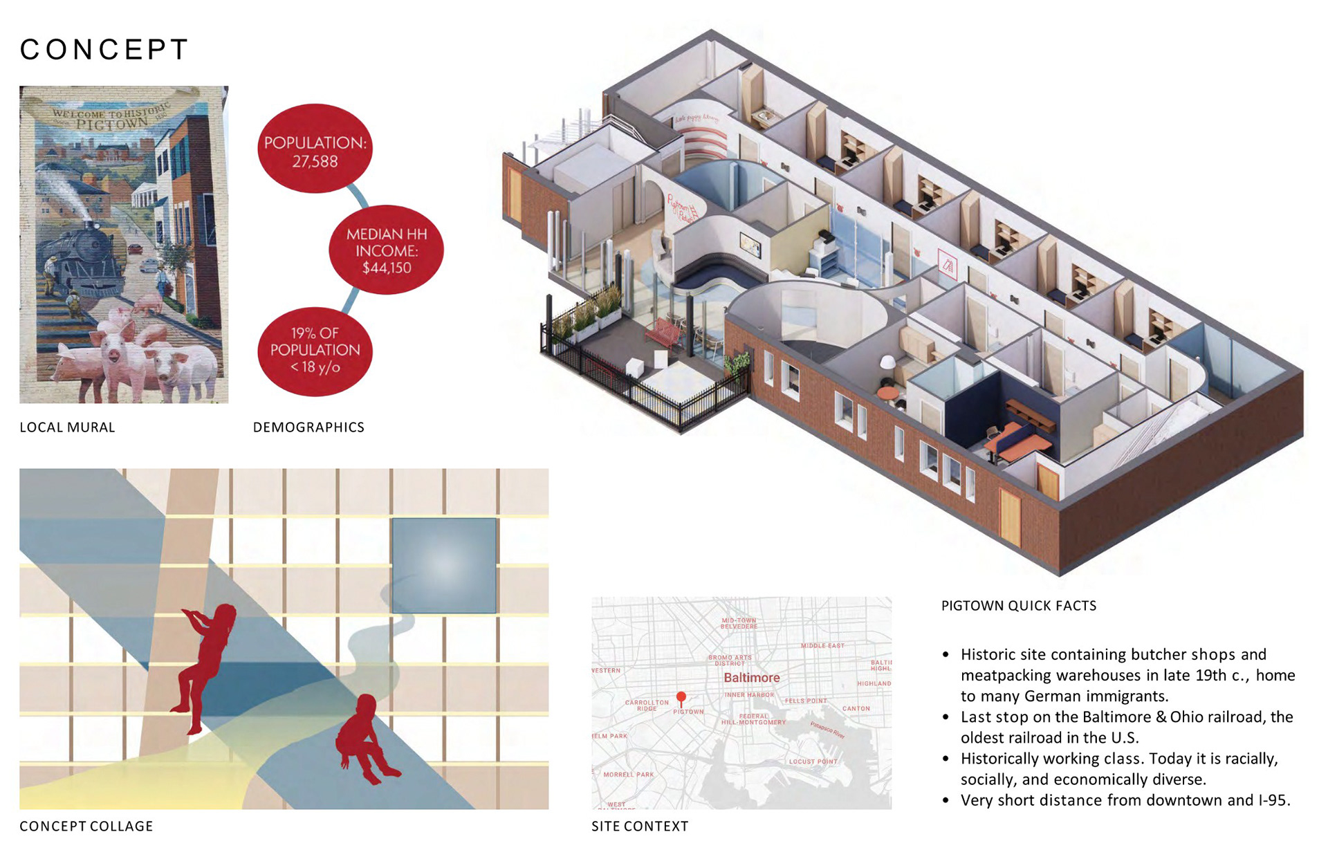 This clinic is designed to create a welcoming and encouraging environment with a playful attitude towards health and well-being for the diverse and growing neighborhood of Pig-town, Baltimore.