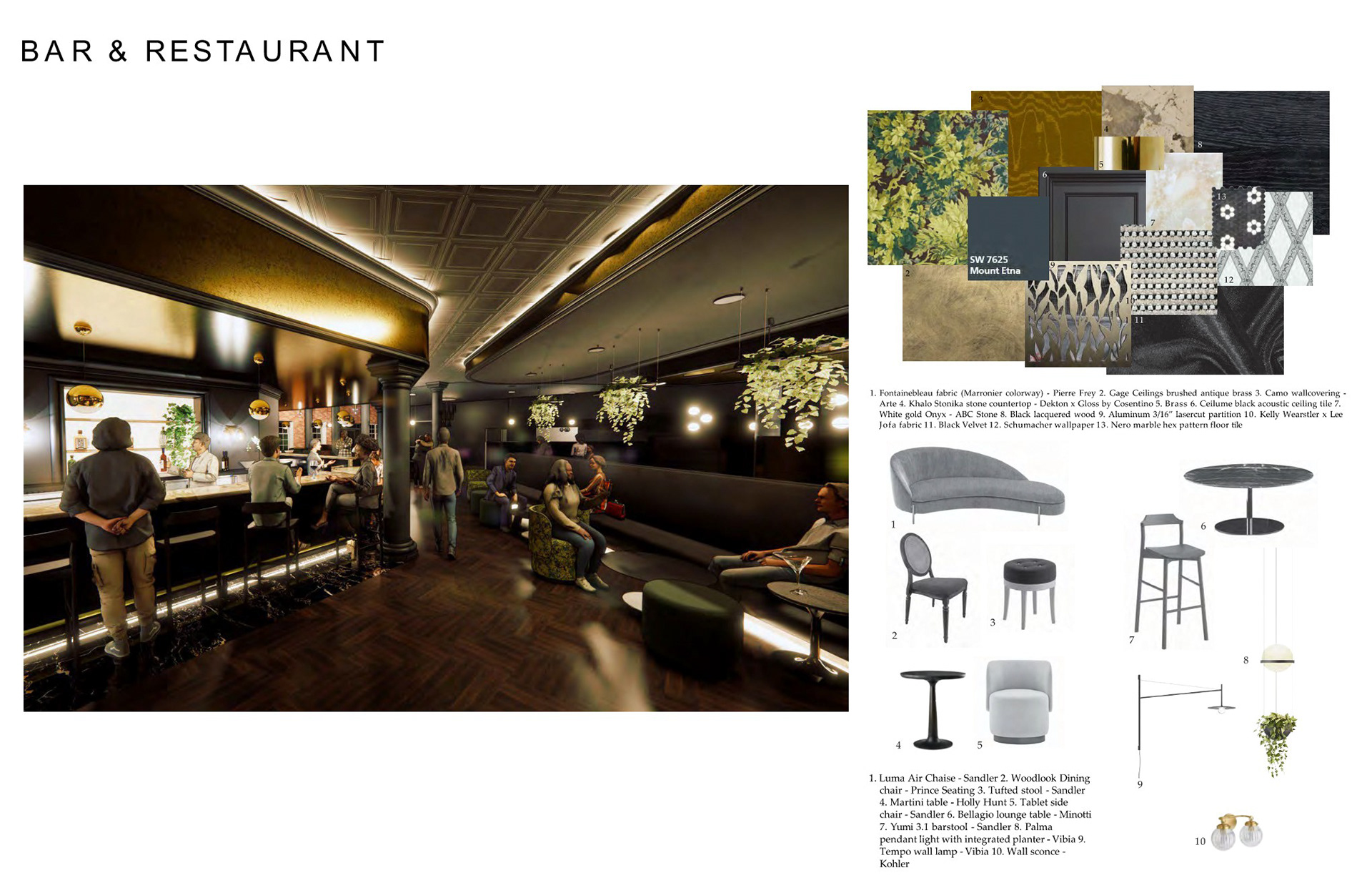 The Windermere Inn greets guests with a cozy English country-style lobby, and takes guests on a transportive journey. Visitors will feel as if they’ve stumbled upon a whimsical garden after wandering through the misty moors of the English countryside. Biophilic elements, rich verdant hues, and lush materials create an immersive experience that is equal parts restorative and delightful.